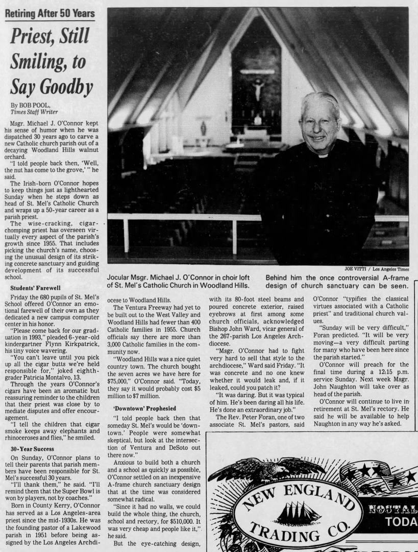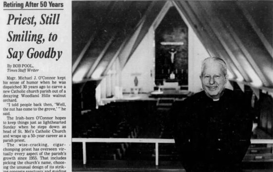 This is sort of hard to accept and – yes – it is out of sequence, too. Remember way back in 1953, that beautiful girl? Well after a continuous honeymoon that lasted for over a year, my little blond and I bought a very modern new home over the Hollywood hills in the “Valley.” She is Catholic, and to keep the honeymoon continuing I became one as well, in a way. Every Sunday we attended church at the St. Mels, a futuristic and prominent A-frame structure on Ventura Boulevard in Woodland Hills. After spending ten hours in the Douglas Think Tank playing with extraterrestrial stuff all day, eating dinner with my little sweetie, I went to class to learn how to be a good Catholic.